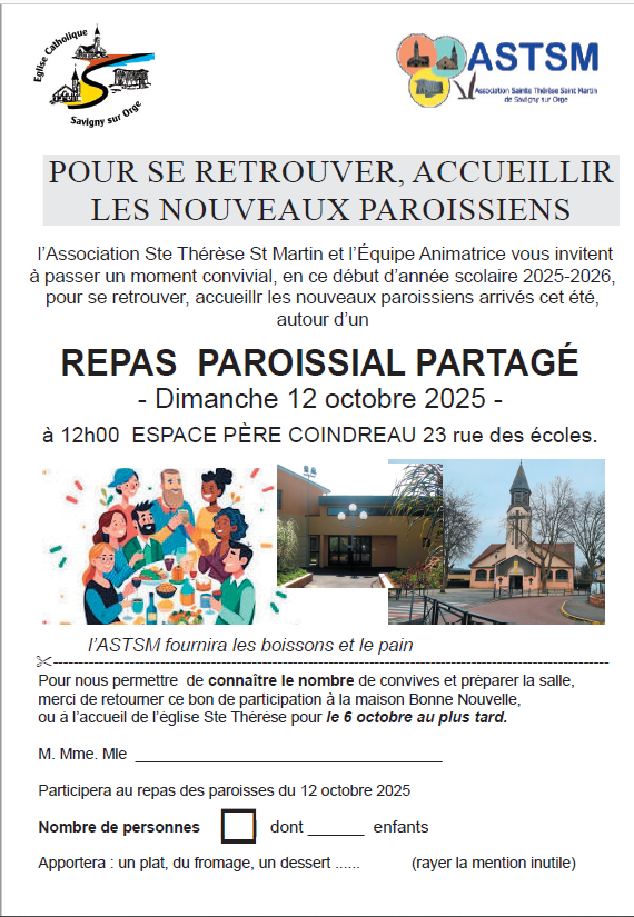 L’association Ste Thérèse St Martin et l’Équipe animatrice vous invitent à passer un moment convivial, en ce début d’année scolaire 2025-2026, pour se retrouver, accueillir les nouveaux paroissiens arrivés cet été, autour d’un repas paroissial partagé.